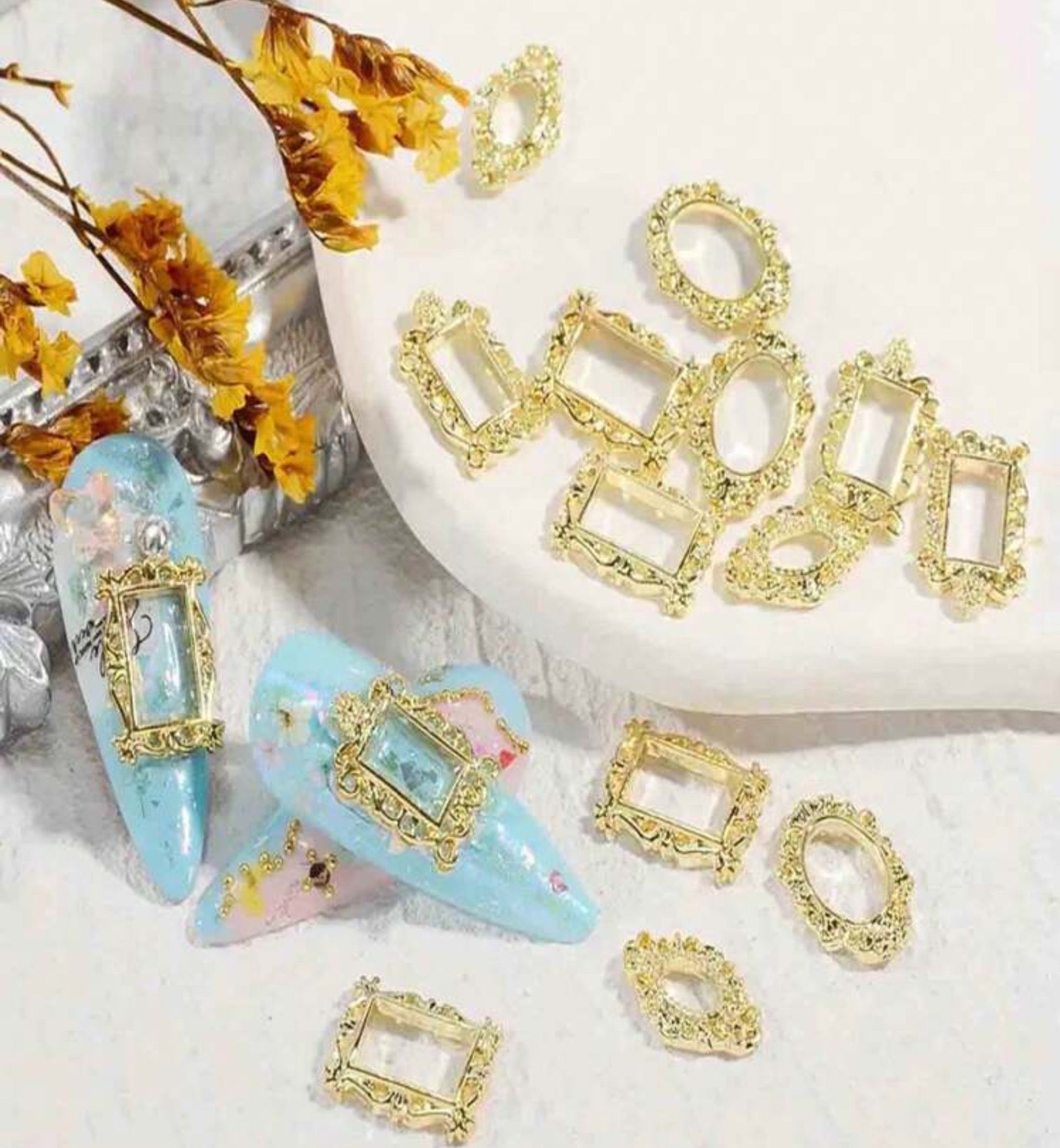 Donnez à vos manucures un style unique, chic et artistique grâce à ces superbes cadres métalliques baroques. Déclinés en formes ovales et rectangulaires, avec une finition dorée ils permettent d’encadrer pierres, perles ou strass pour transformer vos ongles en véritables bijoux.