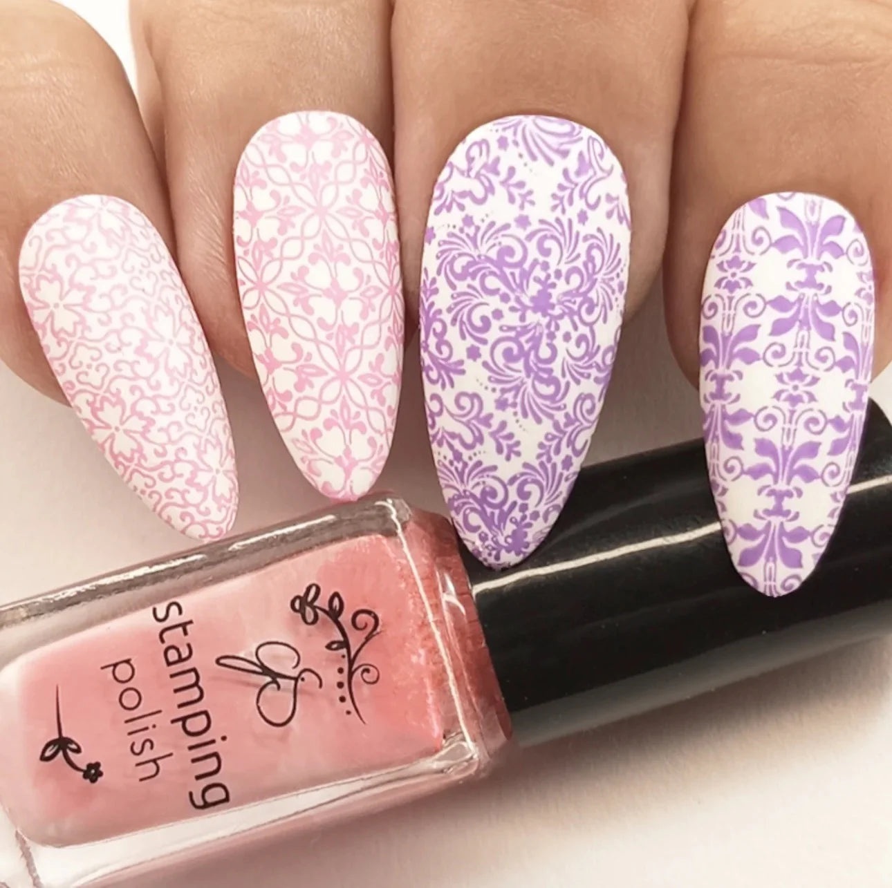 On y retrouve de grands motifs pleine surface, idéals pour un stamping intégral, ainsi que de nombreux éléments individuels (arabesques, fleurs, détails décoratifs) permettant des créations personnalisées, en accent nail ou en superposition.