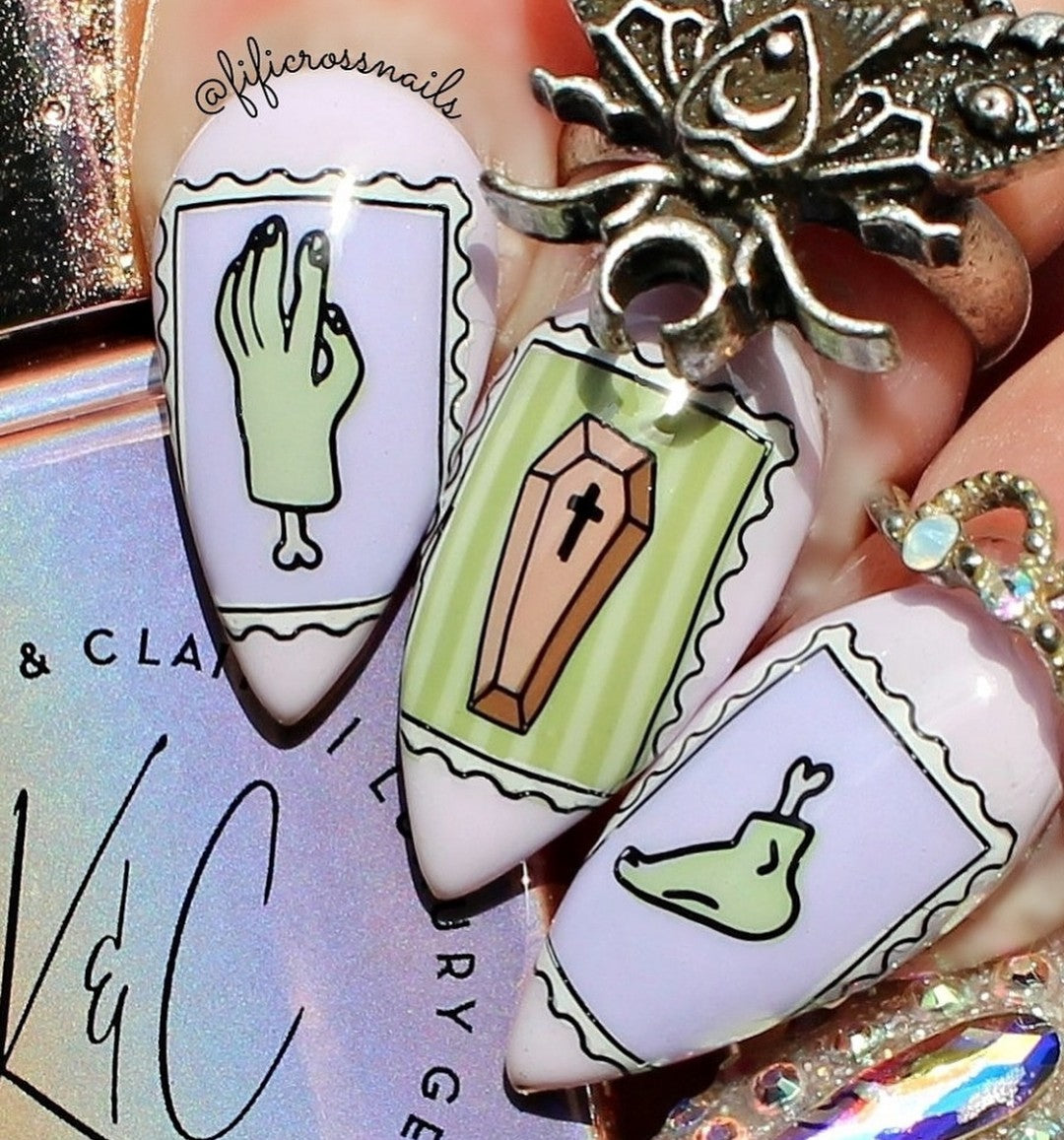 Préparez vos ongles pour Halloween avec cette plaque d'estampage effrayante ! 👻 Des lettres effrayantes et des cadres de style postal aux citrouilles, chauves-souris, fantômes et chats noirs - ainsi que du maïs sucré, des cupcakes, des crânes et des os - il regorge de tous les trucs et friandises pour un nail art obsédant et amusant.