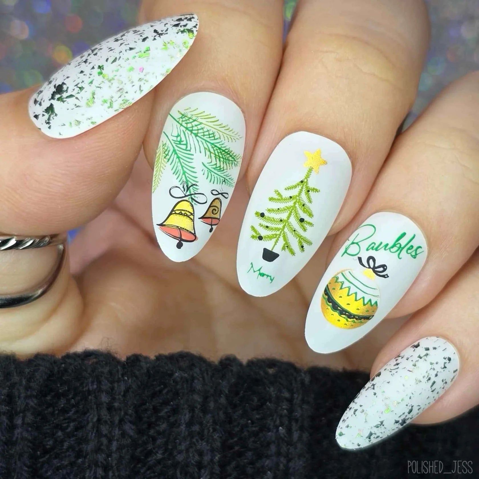 Décorez vos ongles avec un flair festif ! 🎄 Cette charmante plaque d'estampage est dédiée à la décoration de votre arbre - avec des boules, des cloches et des ornements à gogo, y compris le Père Noël, un bonhomme en pain d'épice et un joyeux bonhomme de neige. Créez un nail art joyeux et superposé qui capture l'éclat et l'esprit de la taille de l'arbre et de la célébration de la saison avec style ! ✨🎅🍬
