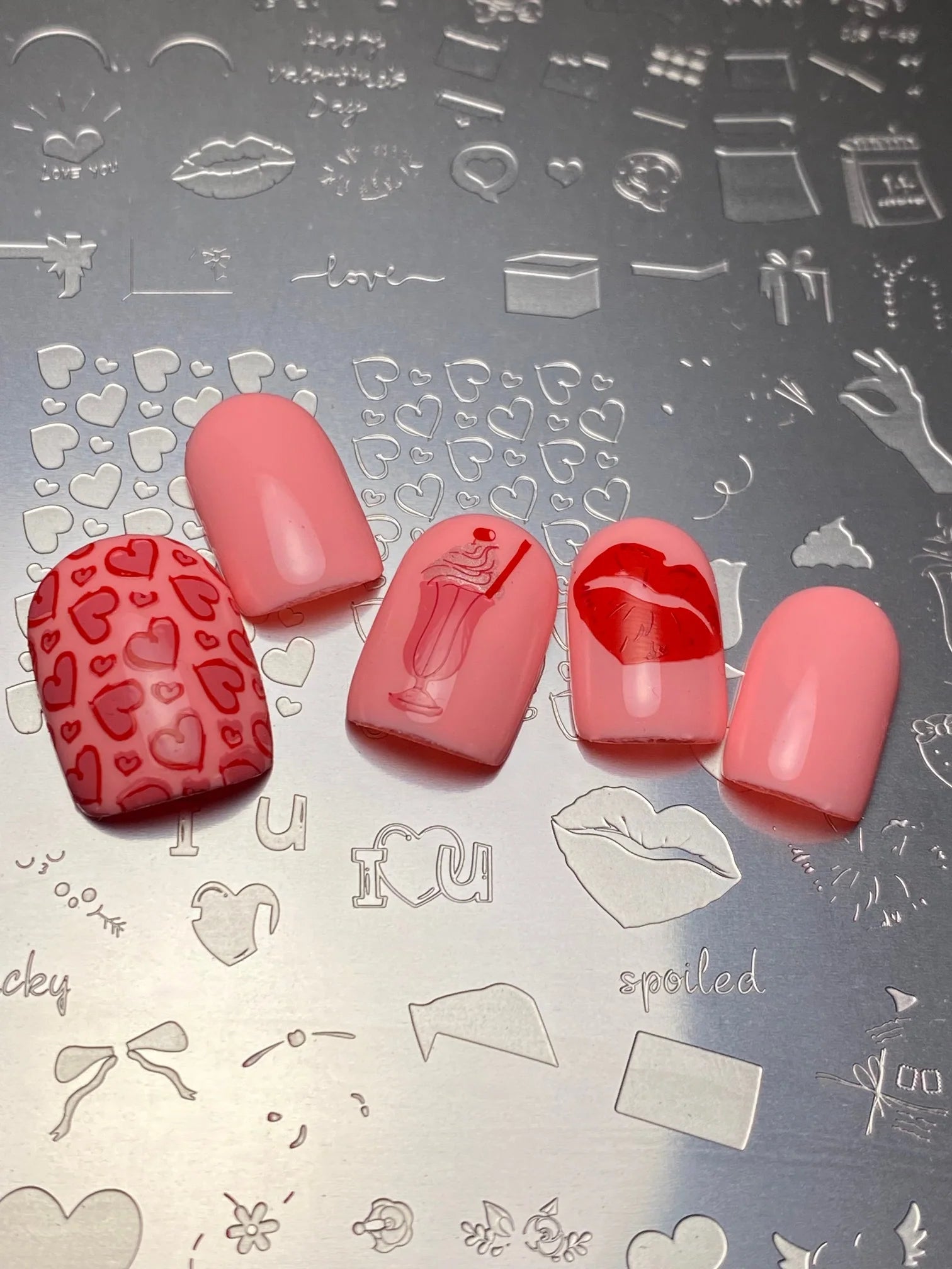 Tombez tête baissée pour Sealed With a Kiss - une assiette d'estampage pleine de romance avec des chocolats, des lettres d'amour, des arcs, des bagues, des cerises et des icônes de la Saint-Valentin pour une reine. Parfaite pour créer des ongles doux et séduisants avec une touche de luxe, cette assiette fait que chaque manucure ressemble à une histoire d'amour. 💌🍒