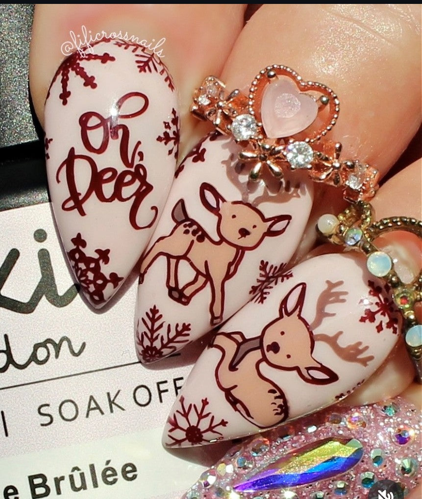 Associez les faons à des flocons argentés ou des roses rouges pour une manucure douce et féérique.