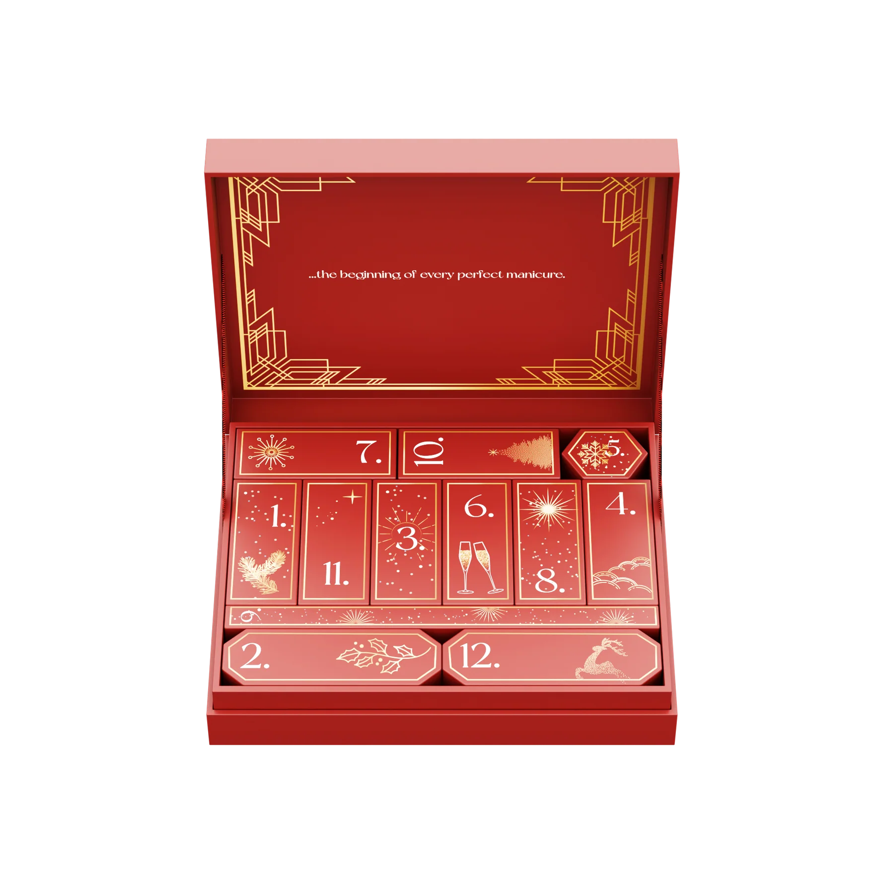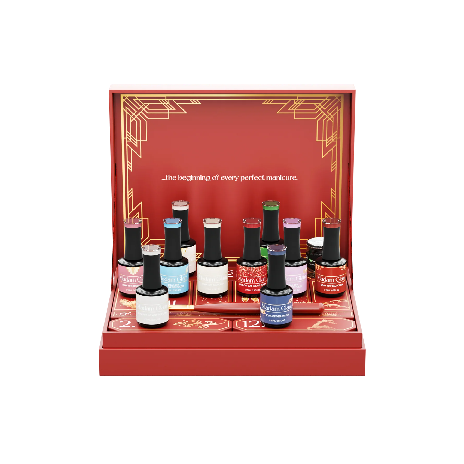 Entrez dans l'âge d'or du glamour avec le calendrier de l'Avent en édition limitée 2025 de Madam Glam, une collection de vacances inspirée de Gatsby. Cette année, nous vous invitons à vous adonner à l'opulence, à la sophistication et à la beauté intemporelle alors que vous comptez à rebours jusqu'à la période la plus magique de l'année. Conçu avec des détails complexes en feuille d'or, des motifs géométriques élégants et une couleur bordeaux frappante, cet article de collection incarne l'esprit des fêtes somptueuses de Gatsby. Derrière chaque porte de cet ensemble en édition limitée, vous trouverez une sélection de produits pour les ongles haut de gamme, assurant un compte à rebours magique et élégant jusqu'à Noël :