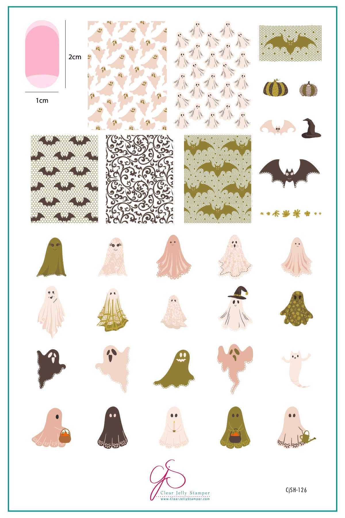 PrĂ©parez vos manucures dâHalloween avec cette adorable plaque remplie de petits fantĂŽmes, de chauves-souris et de citrouilles! La CJS-126 â Spooky Cute Ghosts vous permet de crĂ©er des nail arts Ă la fois effrayants et charmants grĂące Ă ses motifs superposables typiques de Clear Jelly Stamper.
