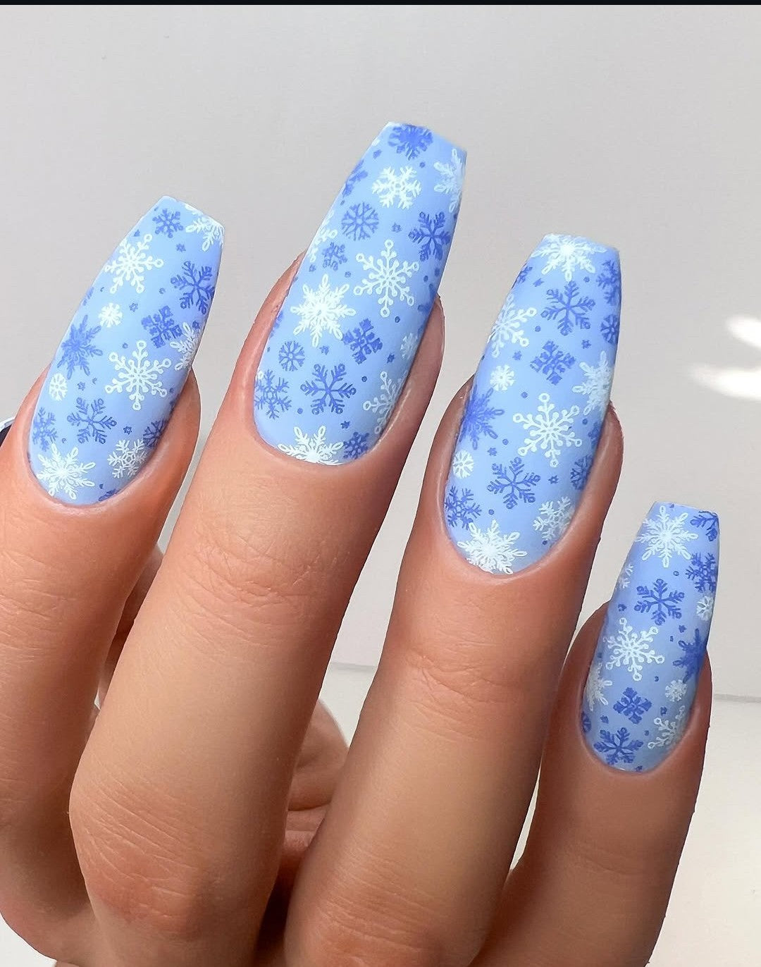 CrĂ©ez des ongles de fĂȘte irrĂ©sistibles en combinant les cadeaux colorĂ©s, les sapins dorĂ©s ou verts mĂ©talliques, et les flocons bleutĂ©s pour un effet magique.